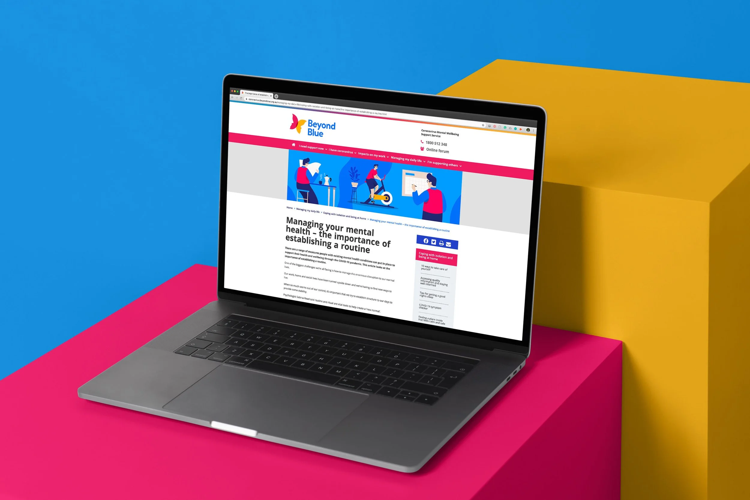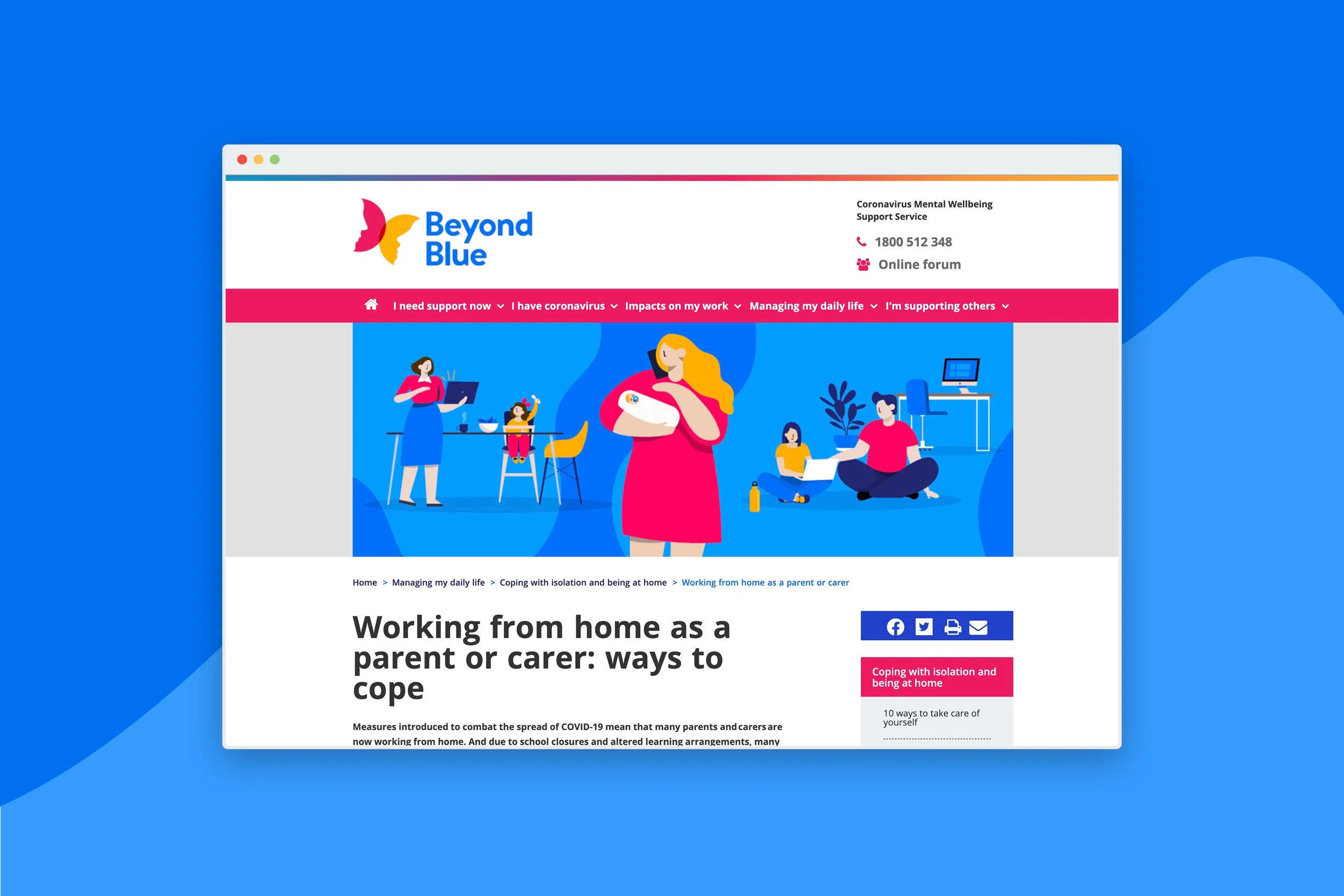 Beyond Blue is a mental health organisation that aims to equip everyone in Australia with the knowledge and skills to achieve their best possible mental health. Beyond Blue were commissioned by the government to build a website to help people manage their wellbeing and mental health during the COVID-19 pandemic. The website is regularly updated with information, advice, strategies and helpful articles. I provided Beyond Blue with a suite of illustrations to accompany these articles and to use on their social media channels.